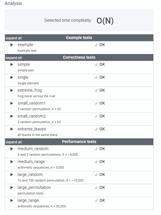 The goal is to find the earliest time when the frog can jump to the other side of the river. The frog can cross only when leaves appear at every position across the river from 1 to X (that is, we want to find the earliest moment when all the positions from 1 to X are covered by leaves). You may assume that the speed of the current in the river is negligibly small, i.e. the leaves do not change their positions once they fall in the river.
