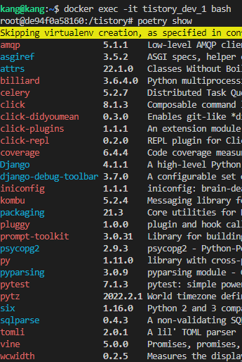 • poetry config virtualenvs.create false virtualenv 미 생성 명령어로 Dockerfile에 필수로 추가해야하는 명령어입니다. 미 입력 시,