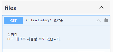 description: 접은글을 펴면 상단에 위치한 description을 볼 수 있다.class TistoryView(APIView): @extend_schema( tags=['files'], summary="요약줄", description="""설명란<br/> html 태그를 사용할 수도 있습니다. """, ) def get(self, request): ...
