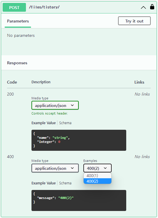response_only: response에만 들어갈 내용인지class TistoryView(GenericAPIView): serializer_class = TistorySerializer @extend_schema( request=None, responses={ 200: TistorySerializer, 400: OpenApiTypes.OBJECT }, examples=[ OpenApiExample( name="400(1)", summary="400(1)", value={ "message": "400(1)", }, status_codes=["400"], response_only=True ), OpenApiExample( name="400(2)", summary="400(2)", value={ "message": "400(2)", }, status_codes=["400"], response_only=True ), ] ) def post(self, request, *args, **kwargs): pass