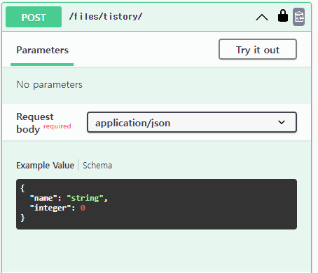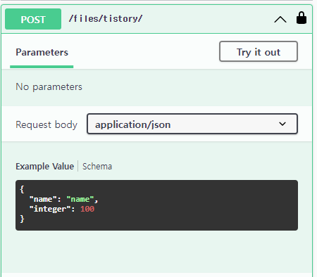 물론 다른 방법으로 inline_serializer를 사용하여 정의할 수 있습니다.class TistoryView(APIView): @extend_schema( request=inline_serializer( name='inline serializer', fields={ "name": serializers.CharField(default="name"), "integer": serializers.IntegerField(default=100) } ) ) def post(self, request, *args, **kwargs): pass
