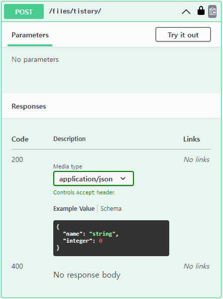 그러나 중복된 status_code의 여러 가지 형태의 response는 보여줄 수 없습니다.class TistoryView(GenericAPIView): serializer_class = TistorySerializer @extend_schema( request=None, responses={ 200: TistorySerializer, 400: None } ) def post(self, request, *args, **kwargs): pass