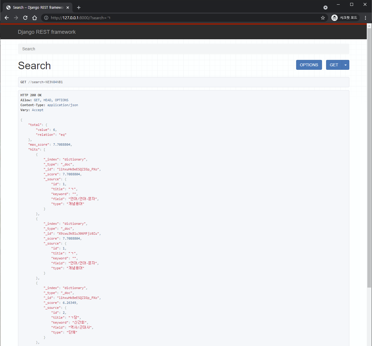 (http://127.0.0.1:8000/?search=ㄱ) 로 접속하여 결과창을 확인 해봅시다.