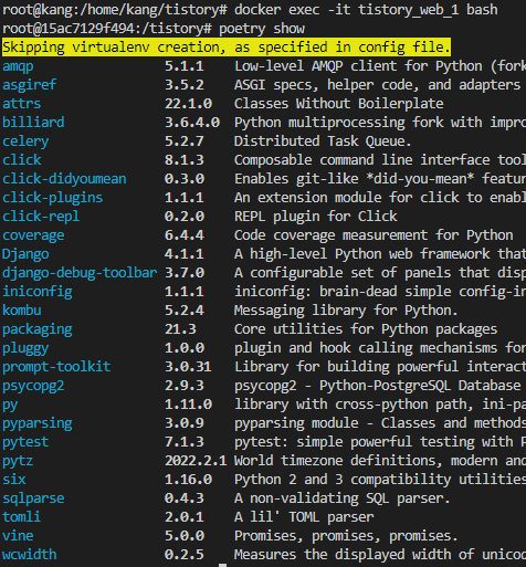 - poetry config virtualenvs.create false virtualenv 미 생성 명령어로 Dockerfile에 필수로 추가해야하는 명령어입니다. 미 입력 시,